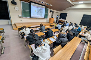 講義は90分を超える長時間となりましたが、学生たちは終始私語もなく、集中して受講していました。最後には本日の講義を振り返る課題に真剣に取り組む姿が見られ、1年間の学びを自分自身の言葉で文章表現しようとする姿勢が印象的でした。