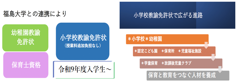 この度、こども保育コースは、福島大学と連携し、令和9年度入学生より、在学したまま小学校教諭免許状が最短3年間で取得できるようになりました。