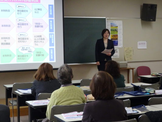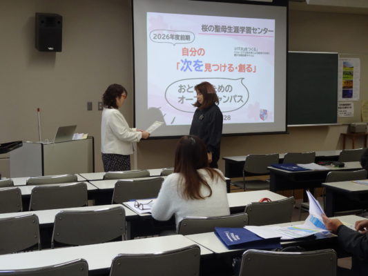 今回はSOCで定められた学修時間を終えられた方々に対して、三瓶生涯学習センター長から履修証明書が授与され、そのあとに本学の建学の精神や生涯学習の重要性と社会人向け学習支援制度の説明がありました。また本科のフルタイム学生として学んでいる社会人(こども保育コース)と科目等履修生として司書課程(キャリア教養学科)を学んでいる社会人の方にも登壇いただき、本学でなぜ学ぼうとしたのか、学習を通して気づいたこと、変化したことなどの講話をいただきました。